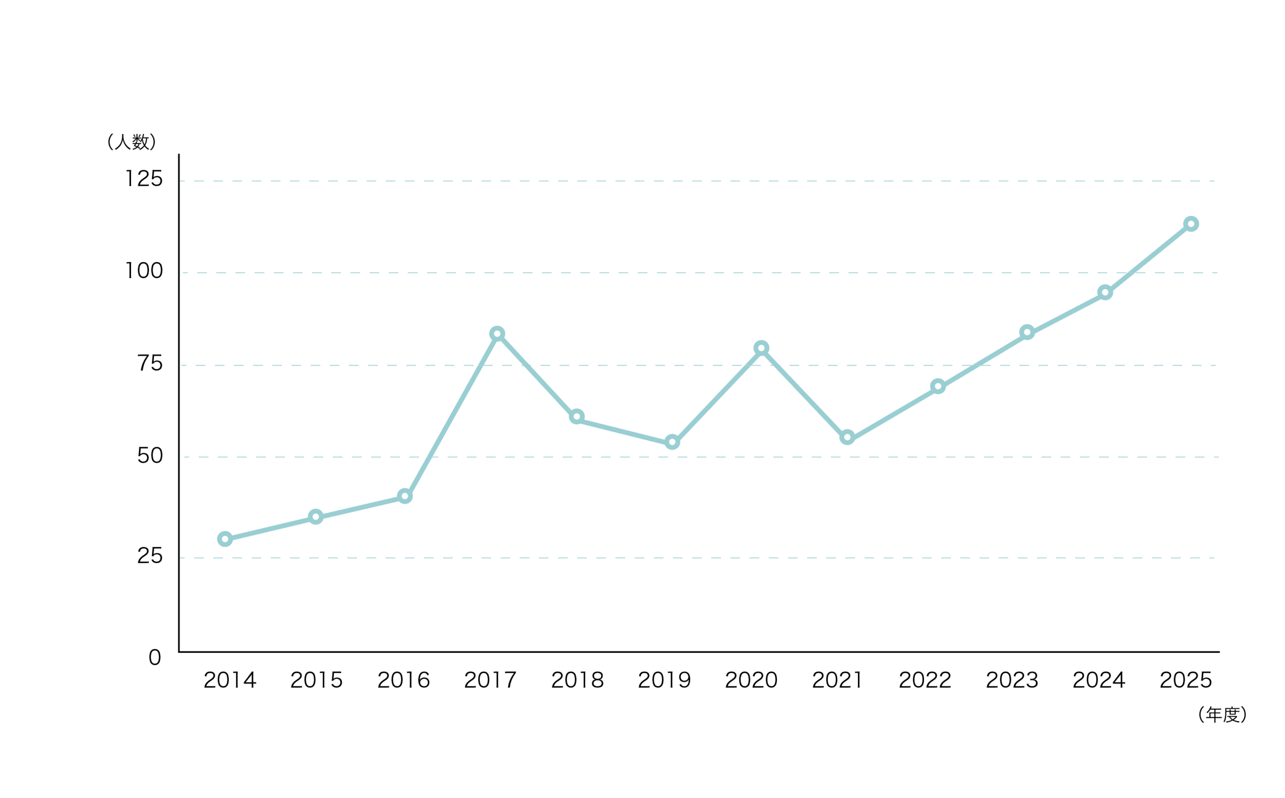 外国人材の受け入れに対する社会的ニーズの高まりを受け、ヒューマンフォースでは年々多くの在留資格取得手続きをご依頼いただいています。制度変更や対象資格の拡大、またコロナ禍による一時的な減少を経て、直近では特定技能や技術・人文知識・国際業務など、就労系在留資格を中心に手続き依頼が再び増加傾向にあります。特に、2023年以降は企業側の受け入れ体制が整い始めたことで、幅広い業種からの相談・ご依頼が増えています。ヒューマンフォースでは、煩雑な申請手続きから、受け入れ後のフォローアップまでを一貫してサポートしており、実績に裏付けられた確かな対応力で多くの企業様にご信頼いただいています。