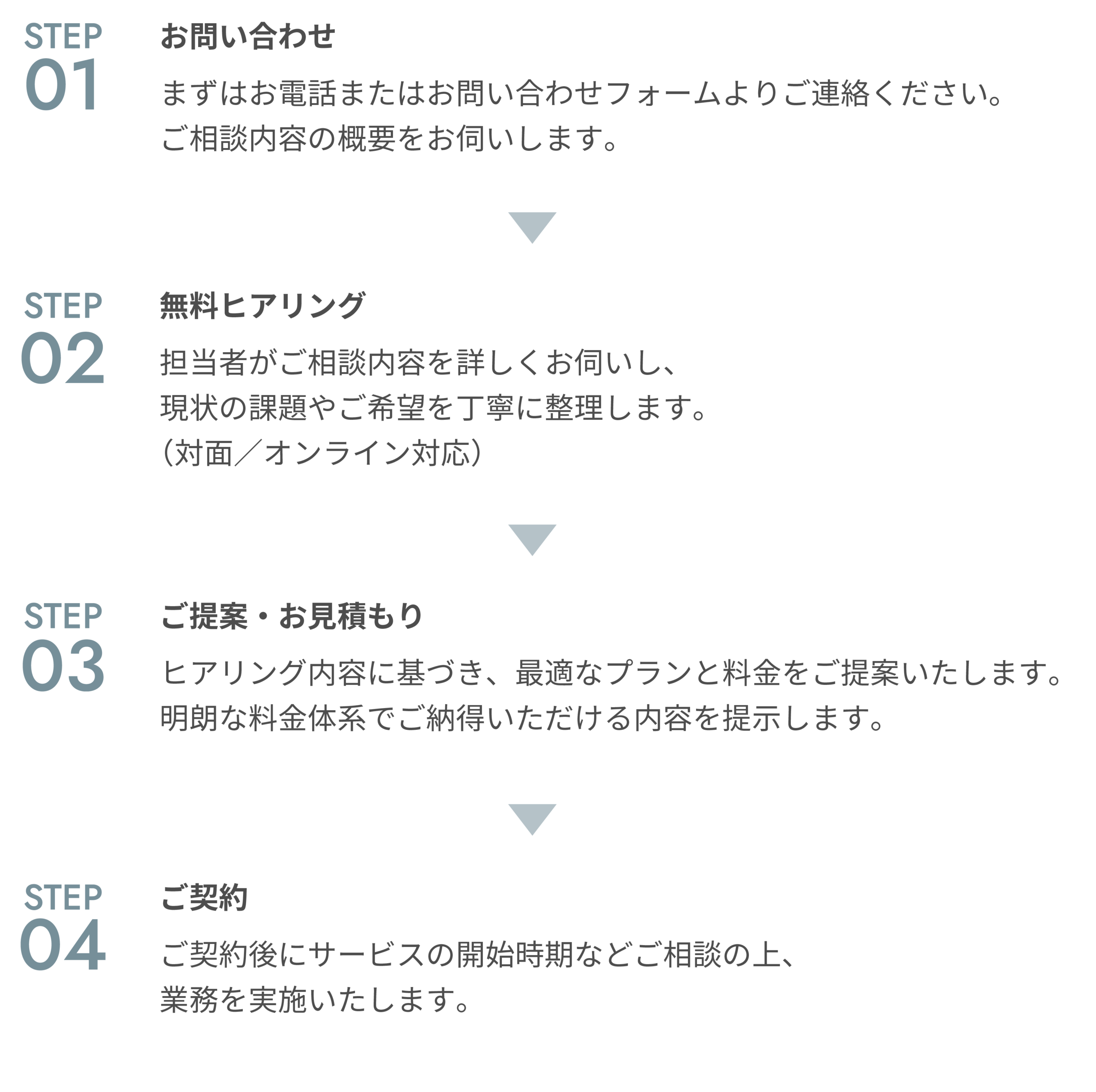 ご相談からご契約・サポート開始までをスムーズかつ丁寧にご案内しております。初めての方でも安心してご利用いただける体制を整えています。